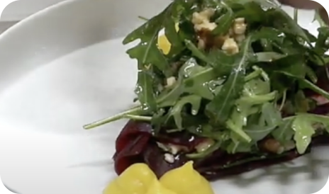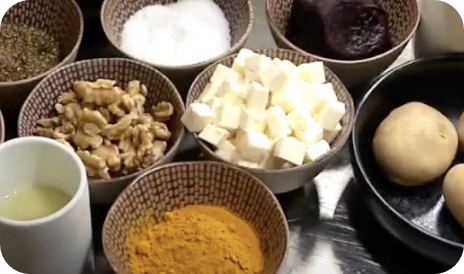 Crespelle di barbabietola con feta, rucola, salsa al limone, curcuma e noci