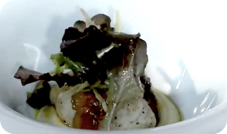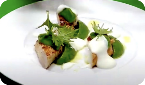 Rana pescatrice lardellata con crema di ceci e olio alle olive nere